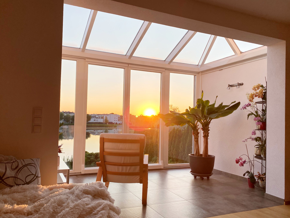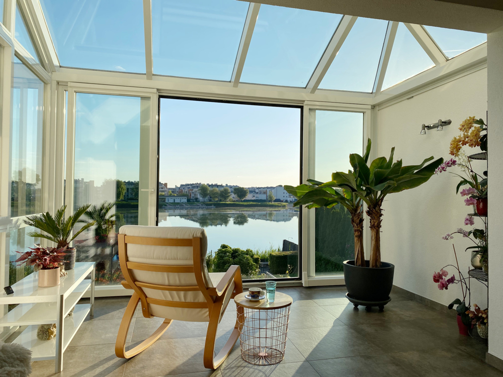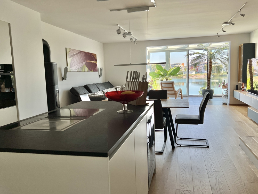 Im Erdgeschoss – dem Lebensmittelpunkt – wartet das großzügige Wohn-/Esszimmer mit offener Küche und dem Wintergarten. Ein herrlicher Platz, um im Sommer wie Winter den Blick aufs Wasser zu genießen. Mit Aussicht gekocht wird in der offenen Luxusküche mit Kochinsel.