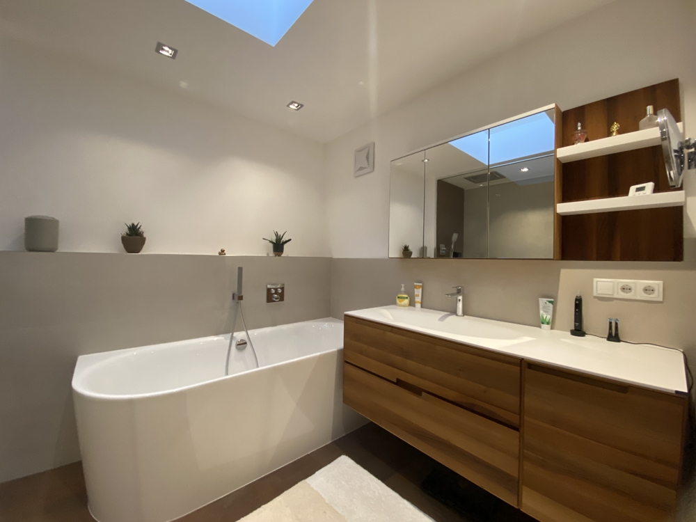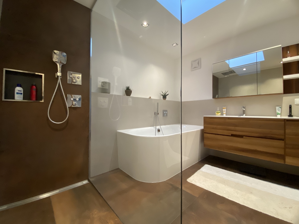 Das Badezimmer mit Tageslicht kann sich sehen lassen: Die große Glasdusche, halb freistehende Badewanne und der großzügige Waschtisch machen das Bad zu einem natürlichen Energiespender am Morgen und Entspannungsort am Abend.