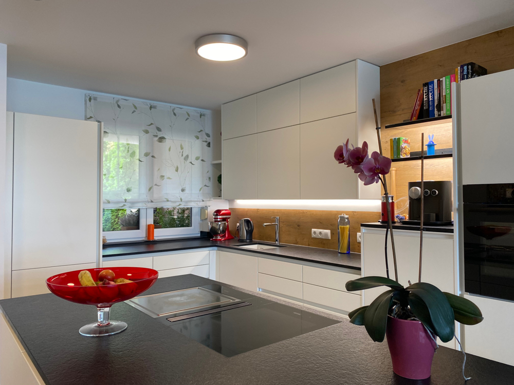 Auf dem Dach befindet sich eine 8,5 kWp PV-Anlage, im Technikraum ein 10 kW Wechselrichter und ein 22,1 kWh Batteriespeicher und Full-Backup für das ganze Haus.